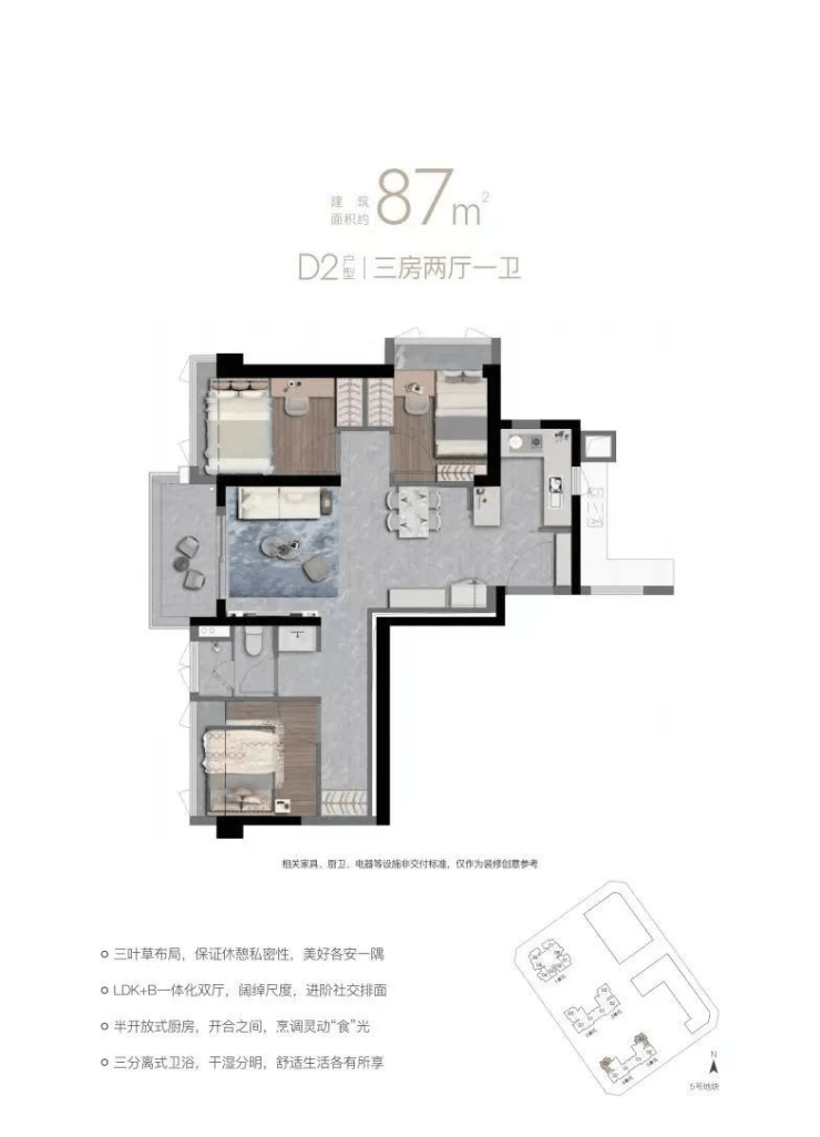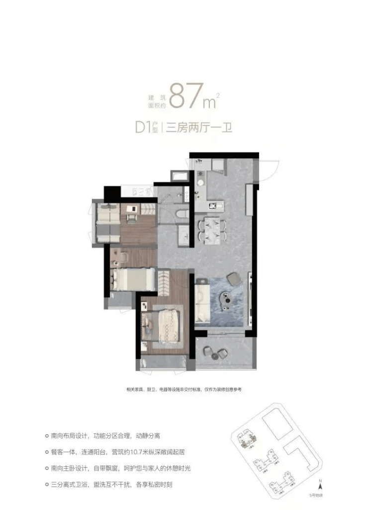 87㎡三室一卫,竖厅/双龙抱珠,D1东南,D2西南/东北。