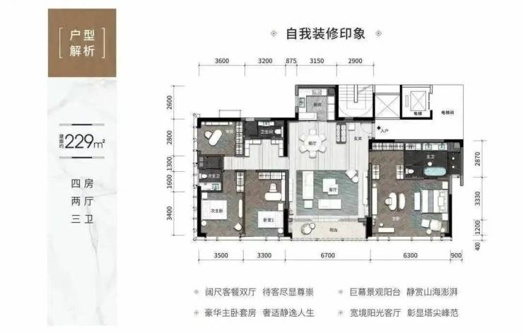 公寓229㎡4房2厅3卫:3.3米层高,6.7米客厅开间,舒适度高,配置较多落地窗,视野通透,空间敞亮感十足,可享受三重景观:山景、海景、城市景观,主卧大套房设计,十分奢华,户型灵动可变,实用型4房可变享受型双主卧3房
