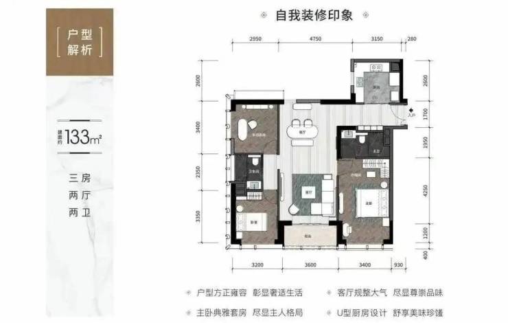 公寓133㎡3房2厅2卫:端头户型,双面采光,通透对流,双龙抱珠,户型方正,卧室开间阔绰,实用率高,U形厨房,操作面大,空间利用率高,厅出阳台,3.15米层高,通燃气,舒适宜居,双面景观,可观山景,可赏园林景观