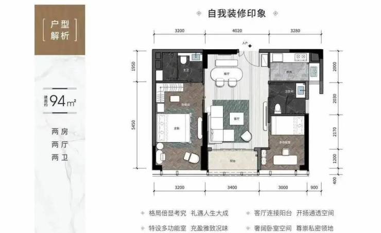 公寓94㎡2房2厅2卫:双龙抱珠,户型方正,实用率高,94平做到两房两卫,市场少有的产品,厅出阳台,3.15米层高,通燃气,舒适宜居,空间通透,卧室奢阔且私密
