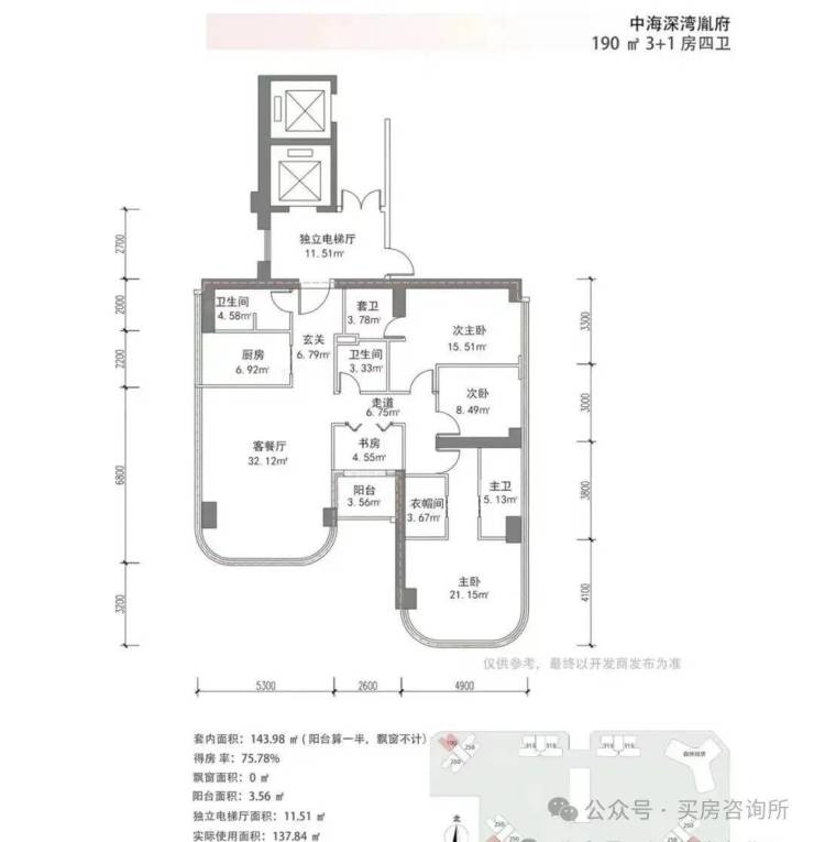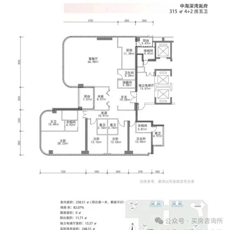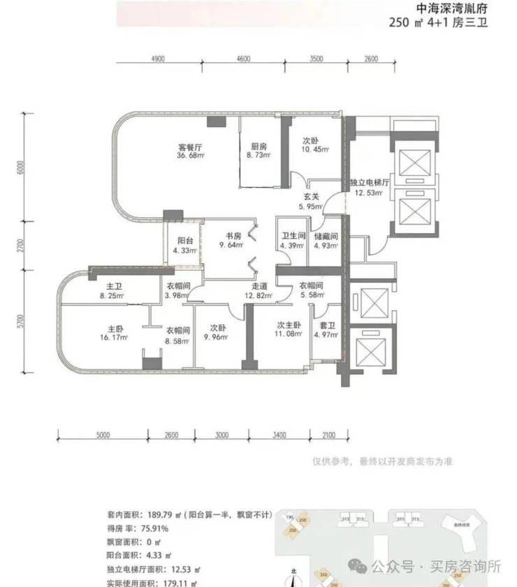 据悉,深湾胤府共规划6栋超高层(含1栋自持租赁住房),将推出514套住宅,户型面积段包括有约190㎡3+1房四卫、约250㎡4+1房三卫、约315㎡4+2房五卫,另外还有410-520㎡之间的顶复。(具体以开发商公示为准)