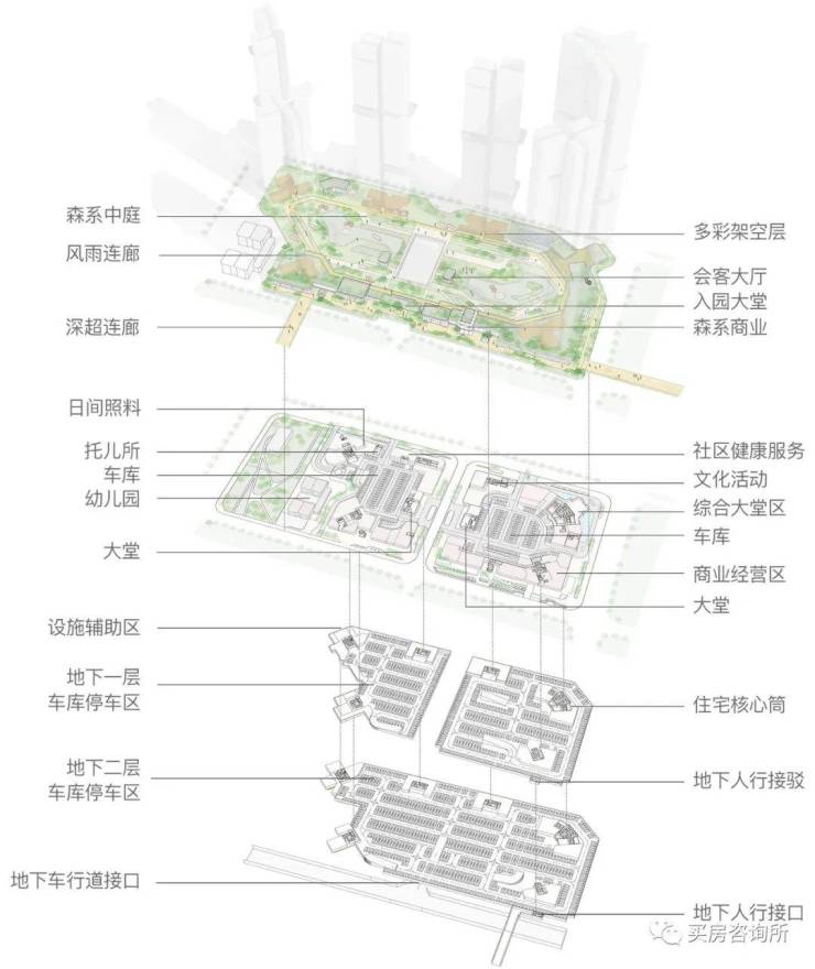 为了过渡、兼顾城市公共性与住区私密性——避免过强的公共性导致住区成为开放的城市街区,也避免过度的封闭性导致住区成为城市孤岛——我们在垂直维度打造了一套过度城市与住区的 “城市甲板” 系统:将城市商业,社区配套服务,文化活动等置于底层,以模糊的边界与公共的功能布局与城市相连;