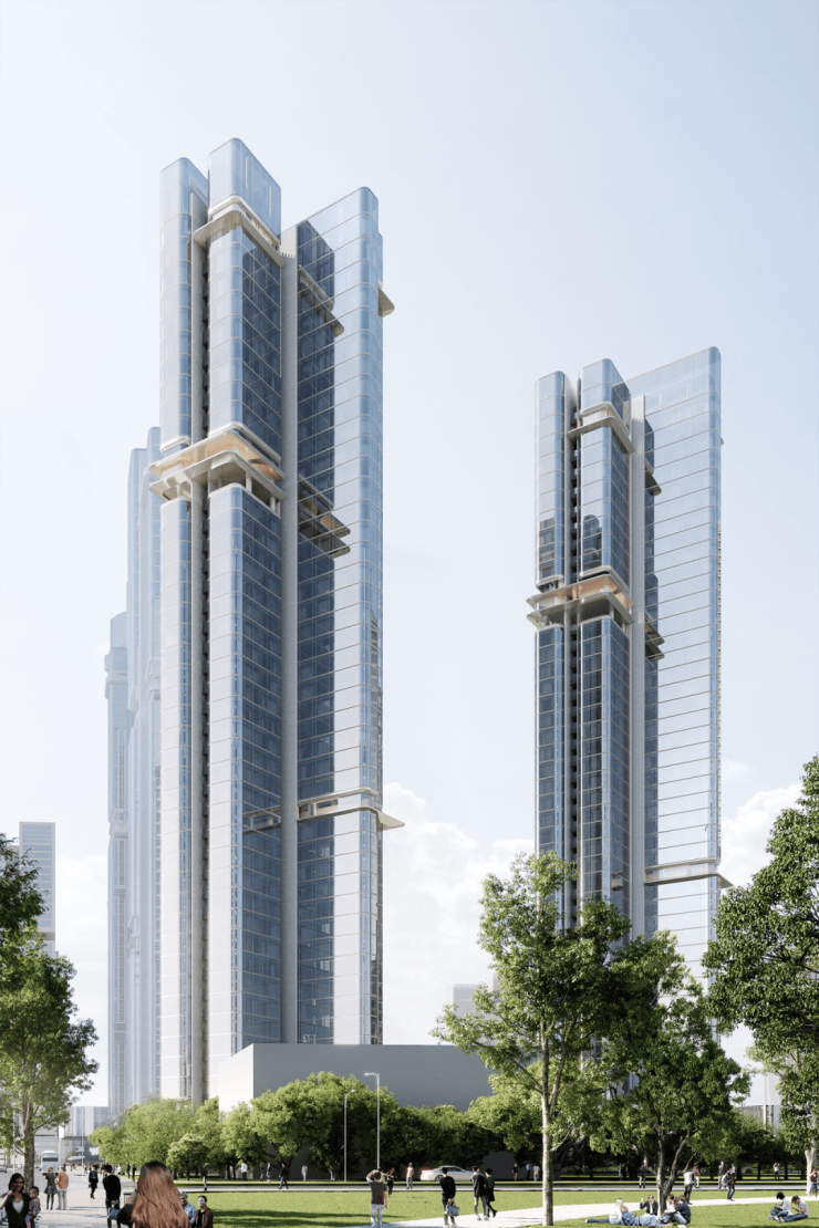 这不仅释放了更多住区内公共空间,也让住宅形式更城市化、公共 (公建) 化,在视觉上更好地融入区域环境,而不显平淡、弱势。楼栋通过扭转布局避免了高密度布局容易产生的对视问题,设计也让每个户型都有270度观景面,将城市风景与风情极致 “引入” 室内,进一步紧密住区与城市的关联。