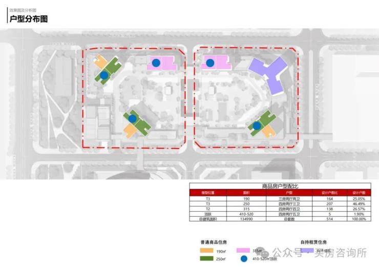 在设计方面,面对6.0的高容积率,若以常规T2 (一梯二户) 户型布局,需要7-8栋住宅楼才能满足数据指标。但深圳的日照要求和场地周边的环境资源给设计提供了新可能,我们以3栋T3 (一梯三户) ,2栋T2 (一梯二户) ,1栋相对独立的 “三芒星” 平面高梯户比垂直社区 (业主自持) ,共6栋住宅便实现了数据指标。