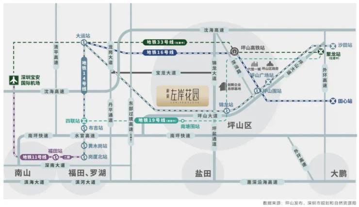 地铁19号线(规划中):坪山首条区内地铁线,项目临近14/19号线换乘站锦龙站,南塘围站。地铁33号线(在建中):深圳市域组团快线,2站大运中心、5站龙华中心、8站机场东。