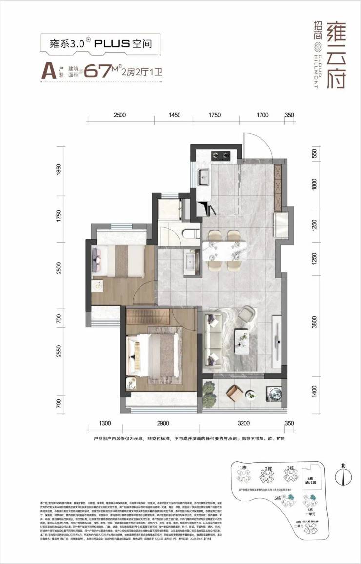 招商雍云府,占地面积约2.7万㎡,总建筑面积约13.36万㎡,计容建筑面积9.76万㎡,容积率3.5,共由6栋22-31F住宅组成,其中1栋商品房31F,2/3/5栋商品房30F,6栋1单元商品房29F,6栋2单元公共租赁住房22F,4栋是1所9班制幼儿园。
