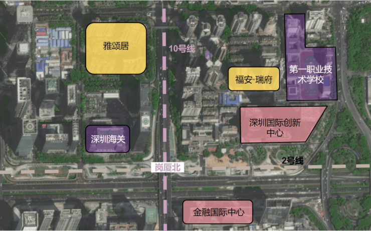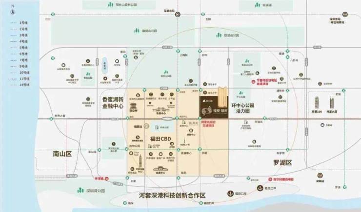 地铁:项目属于岗厦北地铁口项目,岗厦北汇集有地铁2号线(8号线)、10号线、11号线、14号线;另外,项目距离莲花村地铁口步行距离约720米,可搭乘地铁3/10号线