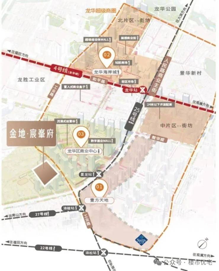 交通方面:位于龙华多条地铁线交汇处,地铁 4 号线龙华站及 6 号线上芬站举步即达,规划中地铁22、25、27号线等站点(规划中景龙站/油福站约400米)就近而设,加上规划中的侨城东路北延线和沙河东路北延线贯通龙华、南山、福田,直抵深圳湾,未来立体交通路网接驳,无界一城繁华生活。