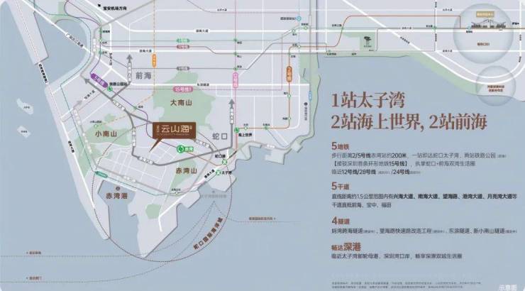 项目位于2号线和5号线交汇的赤湾地铁站,项目紧邻赤湾站——2号线与5号线的交汇站,距离项目2km范围内还有在建地铁12号线左炮台站,同时片区内还规划有地铁28号线,未来公共交通发达。同时,项目可通过小南山隧道或港航路汇入兴海大道,连通前海、后海、宝中等区域。