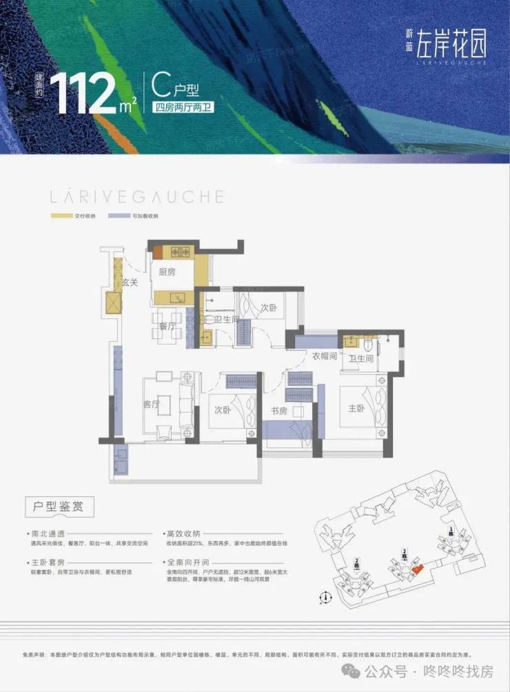 蔚蓝左岸花园项目总占地2.58万平,总建筑面积15万平,共由6栋27-33层的住宅组成,另外项目还自带1628平的商业,共992户,全部为3梯6户的设计,车位有1140个,车位比:1:1.14,比较充足,项目绿化率30%,容积率4.23,物业管理公司为蔚蓝物业,物业费3.9元/平,交房时间为2025年3月底带装修交房。