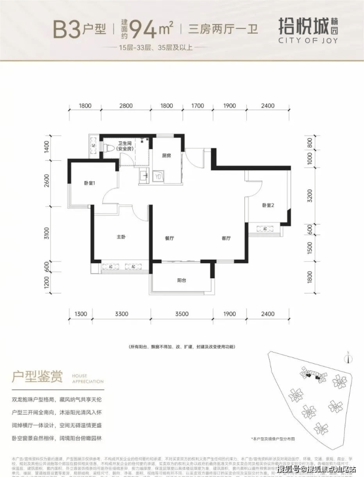 100平三房:设计的是竖厅格局,进门入户玄关,客厅3.4米开间,LDKB一体化设计,3个卧室分别做到了3米/2.9米/2.5米的宽度,U型厨房,公卫三段式分离,得房率:77.14%(不含赠送),阳台1.8米宽度,西南或东南朝向。