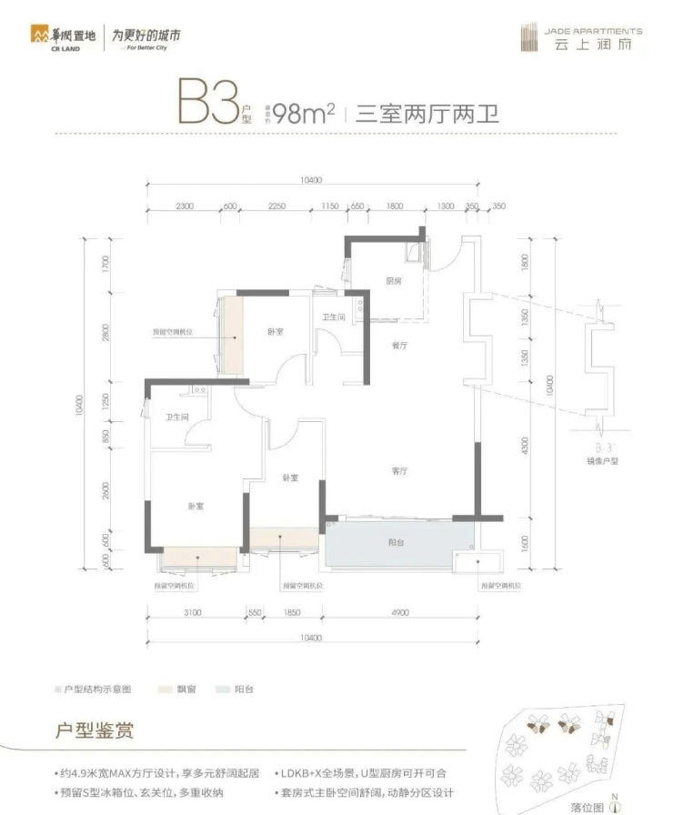 98㎡的3房2厅2卫,B3户型,设计的是MAX方厅,客厅4.9米开间,LDKB一体化+X全场景,S墙设计预留冰箱卡槽位,3个卧室分别做到了3.1米/2.8米/2.4米的宽度,U型厨房,公卫三段式分离设计,得房率83.95%(不含赠送),有西南或东南朝向。