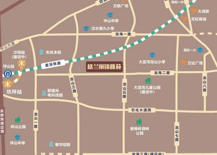 【交通】——约5.4公里深圳地铁14号线沙田站,十余站到福田中心。惠州南站无缝对接广深港。南坪快速三期通车,大亚湾1小时直抵深圳市中心。项目西侧距深圳坪山与大亚湾交界处直线距离约3公里,北侧距惠阳淡水中心区直线距离约4公里,东侧距离万达广场直线距离约2.5公里。