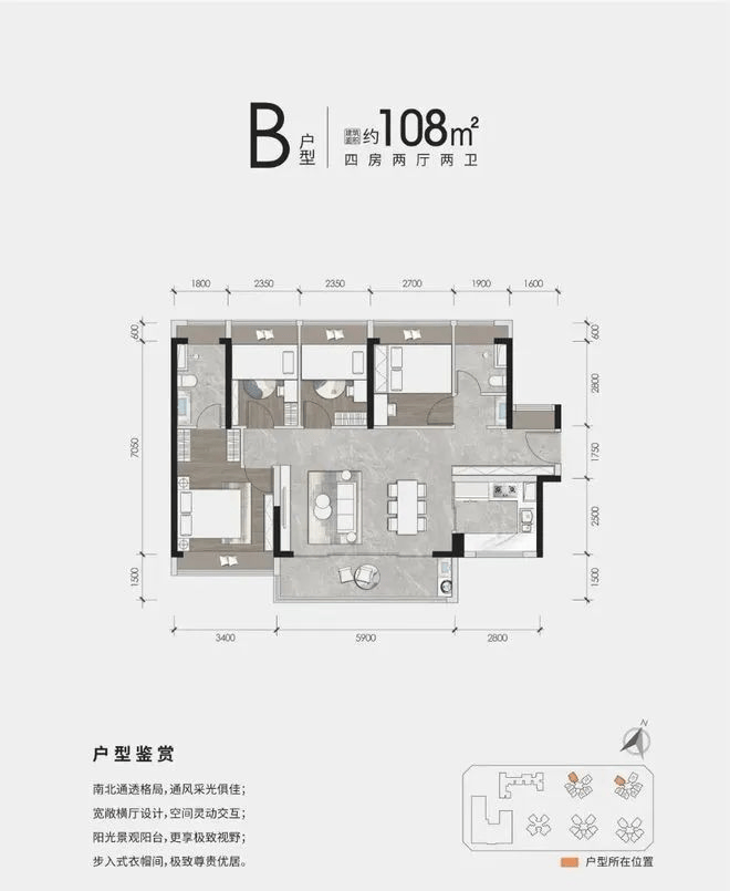 117㎡ 4房2厅2卫:稀缺南北通透、大横厅阔绰4房,约6.6米阔景阳台 ,四分离卫生间