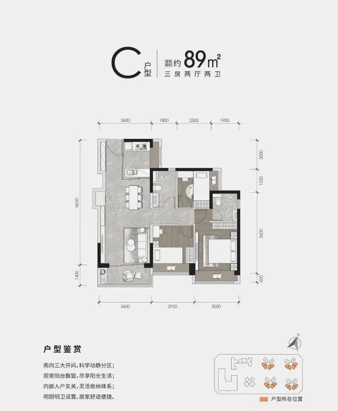 89㎡ 3房2厅2卫:三开间朝南,奢阔主卧套房