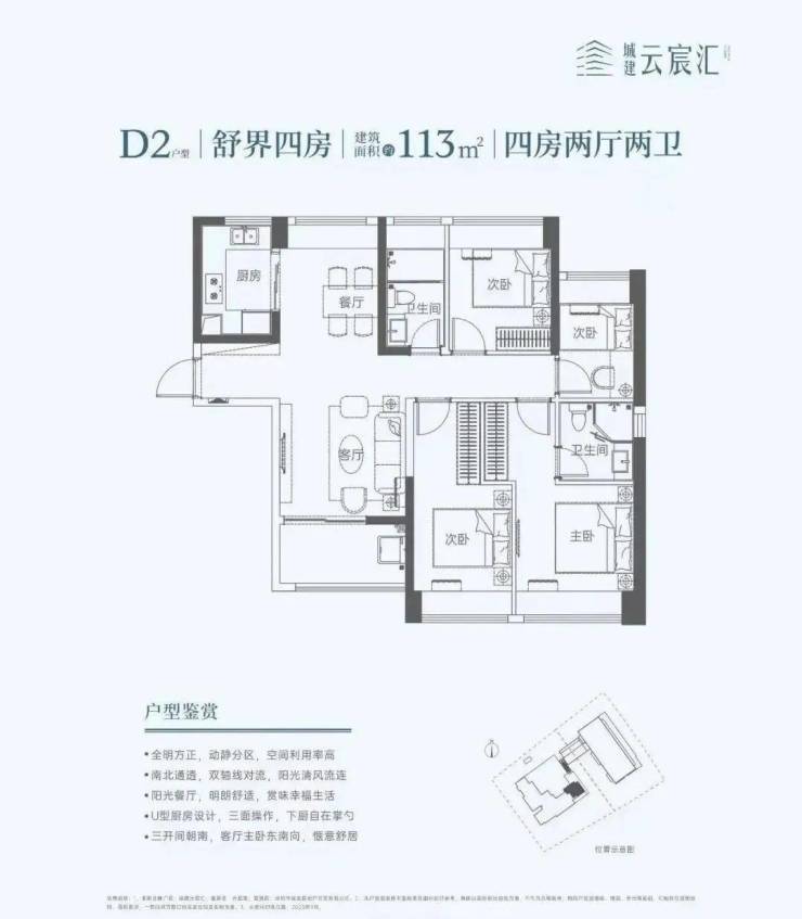113㎡的4房2厅2卫,设计的竖厅南北通透格局,餐客厅一体化,U型厨房,阳台东南朝向