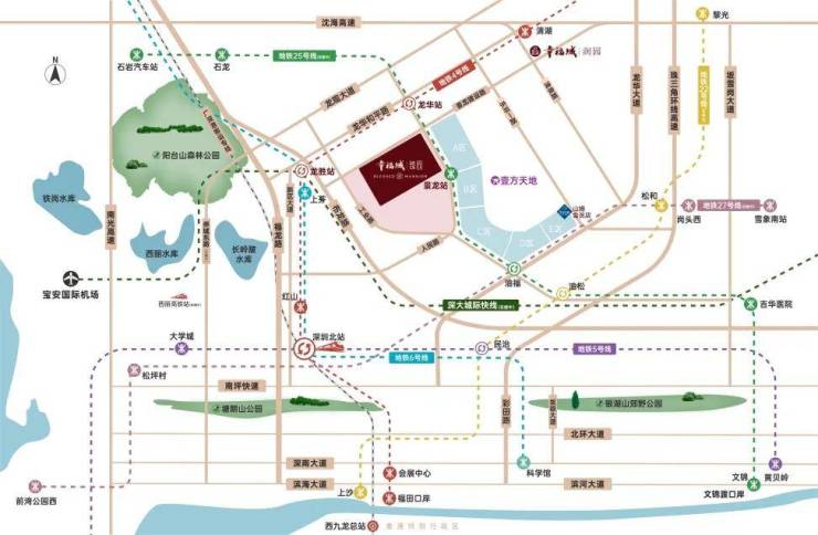 幸福城I臻园直线距离地铁4号线龙华站约400米、直线距离地铁25号线景龙站(在建中,预计2028年开通)约200米,多地铁和城市快线环伺,未来可速达机场、前海、福田中心区,即是繁华的出发地,也是繁华的目的地。