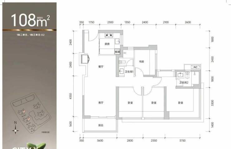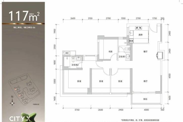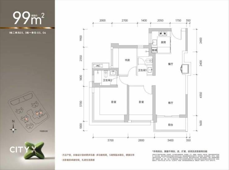 建筑面积约99㎡的3房2卫02/03/05/06户型:全南向爆款空间