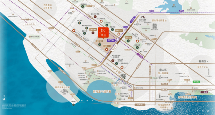 项目为“双地铁物业”,距离5号线与12号线换乘站灵芝站仅约200-400米(不同地块略有差异),2站直达宝安中心,5站至前海湾站,12号线串联南山、蛇口等核心区。