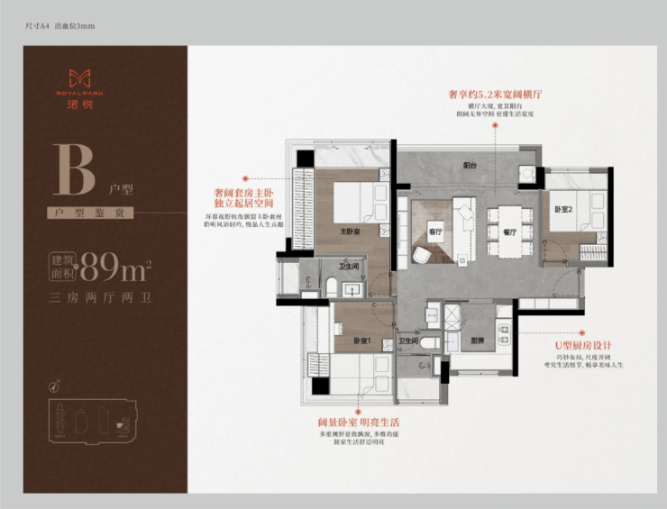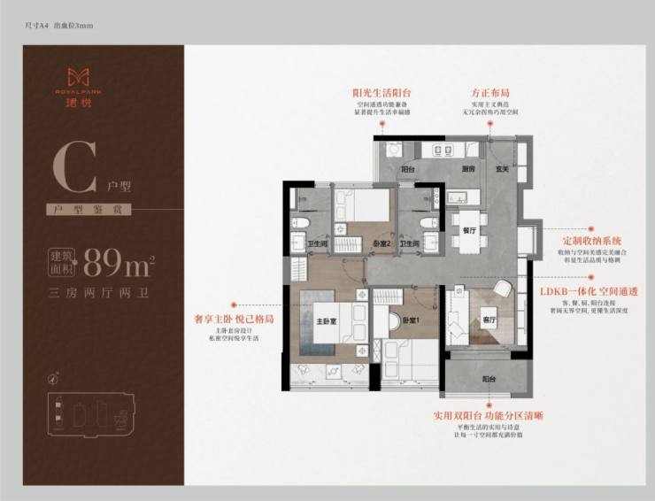 89㎡的3房2厅2卫,A户型(1栋1单元06户型),设计的是经典竖厅格局,进门入户玄关,LDKB一体化,S墙设计预留冰箱卡槽位,三开间朝南,动静分区,主卧双面大飘窗,客厅连接次卧出5.6米长的观景阳台,U型厨房,公卫三段式分离,得房率76.78%(不含赠送),套内面积69.1㎡,东南朝向。