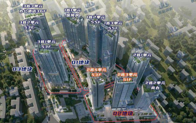 01地块,规划总建面约17.3万㎡,容积率9.28。规划住宅建面约8.9万㎡,商业建面约3.2万㎡。规划为3栋超高层塔楼住宅+幼儿园,1栋一、二单元193米55层,1栋三单元为保障房157米44层。规划1038套,其中保障房612套+回迁179套+可售247套,停车位834个。