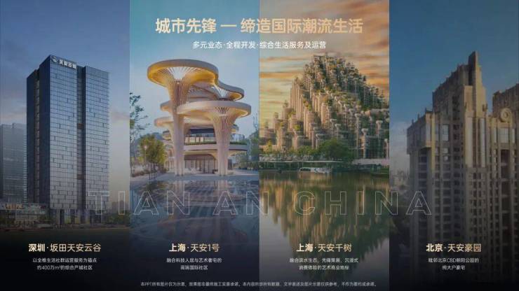 城市先锋:集团在北京、上海及深圳均有深厚的豪宅与地标开发经验,例如:上海天安一号,以及上海知名地标建筑“天安千树”,北京的天安豪园;