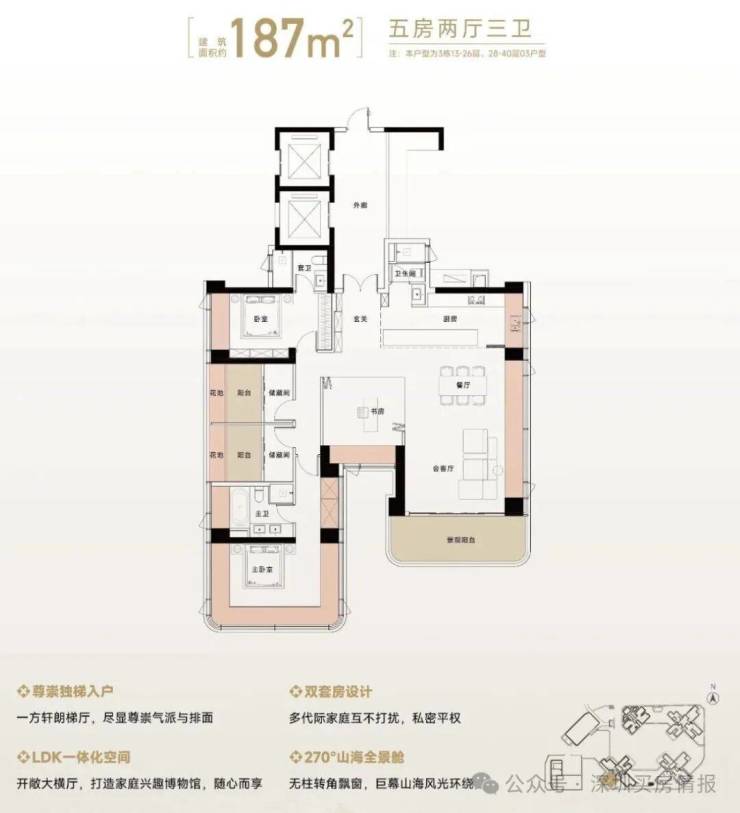 超高得房率:主力户型得房率约102%,约185㎡户型更是高达约111%,花同等价钱可多享约25-48㎡实用空间。270°寰幕全景舱:270°环幕视野及采光,搭配社交化户型布局,既保障山海景观的最大化呈现,又满足家庭互动、亲朋相聚的丰盛场景需求。