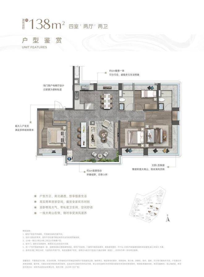 ⑥【一步到位性价比王牌 前海改善头等舱】4栋建面约138㎡奢阔山居范本:LDKB一体化,增配多功能厅、最大约15.5米南向四开间、约6m宽境阳台、主卧270°巨幕飘窗带独立卫浴及衣帽间、最高约94%拓展后综合使用率