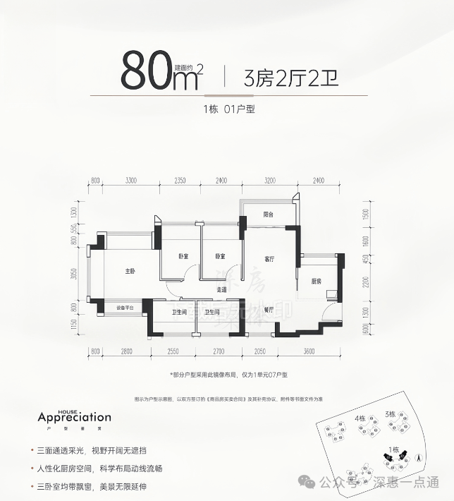 80㎡的3房2厅2卫,设计的是竖厅南北通透格局,进门入户玄关,客厅3.2米开间,LDKB一体化设计,全屋9个飘窗面,分别做到了主卧18.38㎡/次卧7.32㎡/次卧7.16㎡(包含墙体飘窗),U型厨房,卫生间干湿分离,得房率约:104%(包含赠送),阳台主朝西北或东北向。