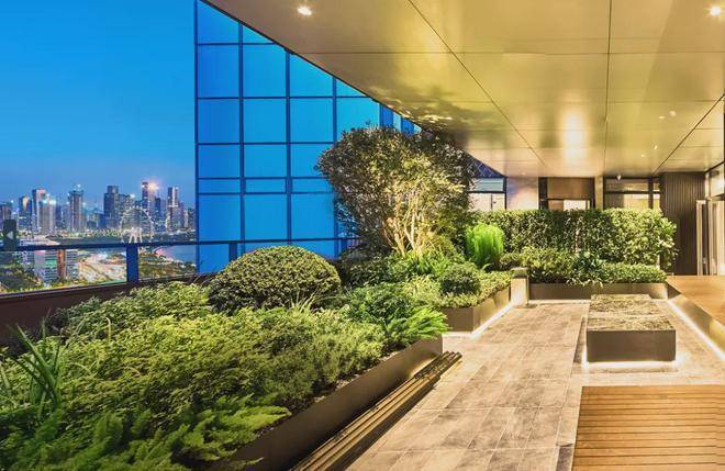 与一楼大堂的空间延伸。这是很聪明的设计,有效的“拉阔了”私家园林的空间力量,约10.2m极致挑⾼⼤堂与超白玻璃的应用,模糊了室内外的边界,亦待大堂亦待园林感。颇有些迈阿密酒店和顶豪生活气场。▽