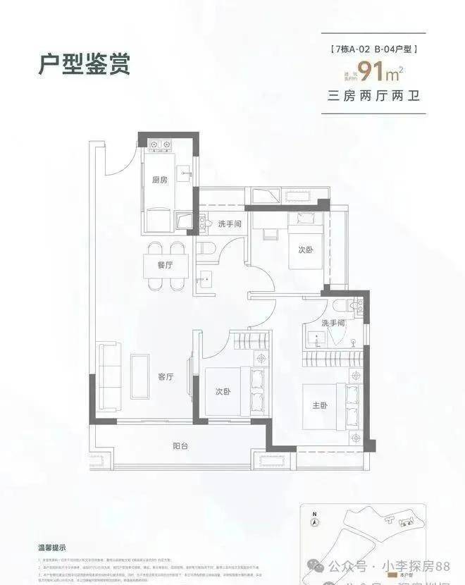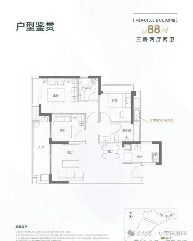 88㎡的3房2厅2卫,设计的是经典竖厅格局,进门入户玄关,客厅3.4米开间,LDKB一体化设计,动静分区,3个卧室分别做到了主卧13.1㎡/次卧8.16㎡/次卧6.41㎡(实测面积,去掉墙体),客厅连接次卧出5.6米长(实测)大阳台,L型厨房,公卫三段式分离,得房率约82%(不含赠送),西南或东北朝向。