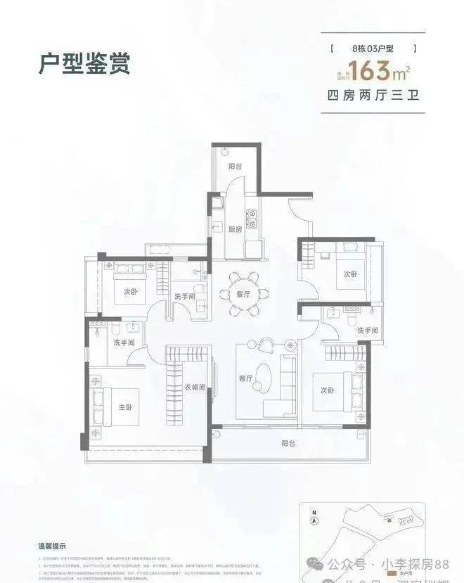 163㎡的4房2厅3卫,设计的是竖厅格局,一梯一户,进门入户玄关,客厅4.2米开间,LDKB一体化设计,三开间朝南,双主卧套房,客厅连接次卧出大阳台,L型厨房还带1个生活阳台,卫生间干湿分离,得房率约82%(不含赠送),东南朝向。