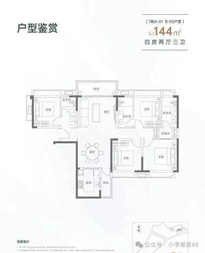 144㎡的4房2厅3卫,设计的是竖厅南北通透格局,双阳台,进门入户玄关,客厅3.8米开间,LDKB一体化设计,双主卧套房,4个卧室分别做到了主卧16.01㎡/次卧11.16㎡/次卧10.46㎡/次卧9.45㎡(实测面积,去掉墙体),L型厨房还带1个生活阳台,公卫干湿分离,得房率约82%(不含赠送),阳台主朝西北向。