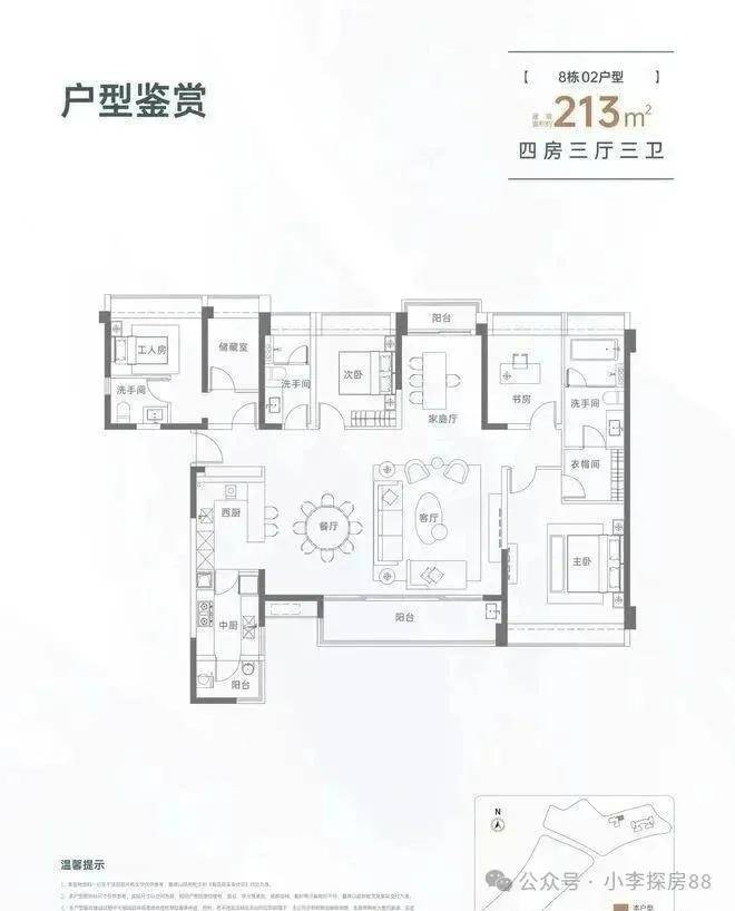 213㎡的4房3厅3卫,设计的是横厅南北通透格局,一梯一户,进门入户玄关,客餐厅6.2米开间,LDKB一体化设计,四开间朝南,双阳台通透,主卧大套间设计,还配有保姆独立套房,中西型多功能厨房,卫生间干湿分离,得房率约82%(不含赠送),阳台主朝东南向。