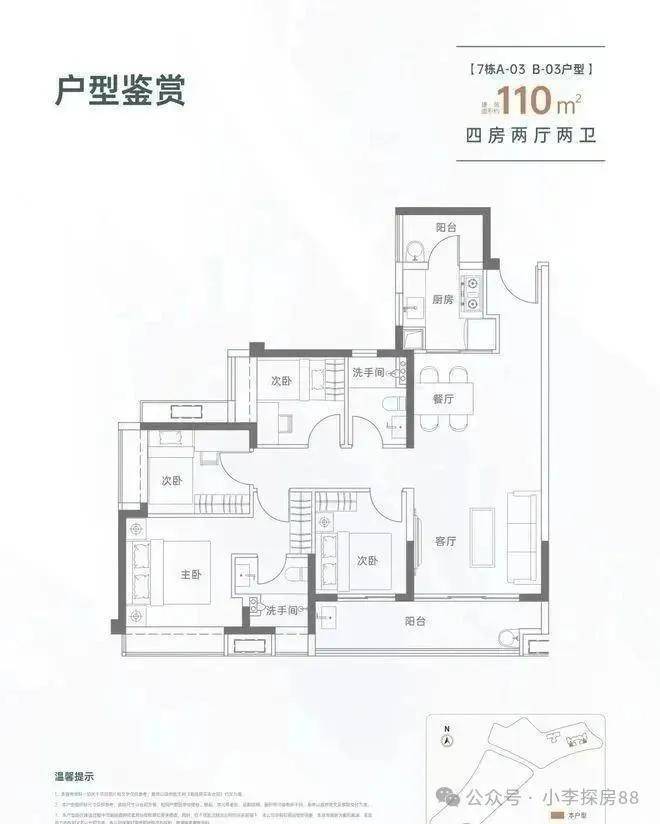 110㎡的4房2厅2卫,设计的是经典竖厅格局,进门入户玄关,客厅3.6米开间,LDKB一体化设计,四开间朝南,动静分区,4个卧室分别做到了主卧13.85㎡/次卧7.6㎡/次卧6.96㎡/次卧6.8㎡(实测面积,去掉墙体),客厅连接次卧出6.2米长(实测)的山景大阳台,L型厨房还带1个生活阳台,卫生间干湿分离,得房率约82%(不含赠送),东南朝向。