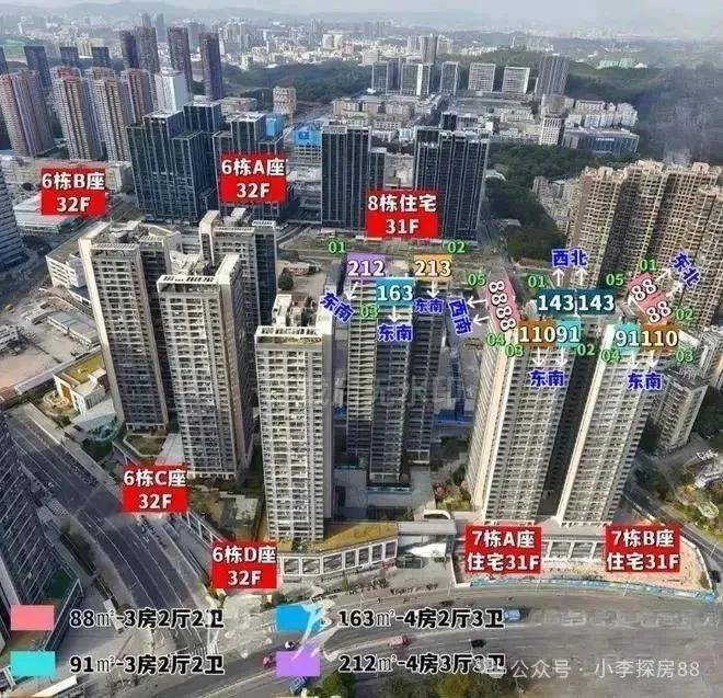 其中7栋分为A、B座,2梯5户,总高31层,精装修交付;8栋3梯3户,主要是大面积户型,161和213㎡的四房三卫,还有6套复式325-417㎡在28-31层,简装交付。