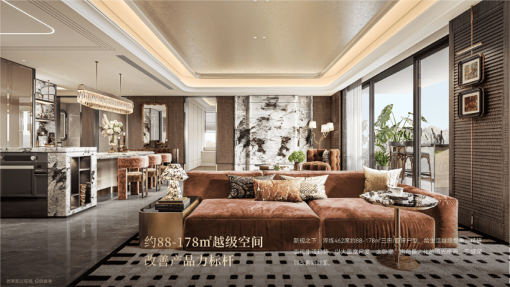 5栋16-25层建筑,勾勒出低密宜居的人文美学之地。超尺度门庭,引领归家的气度。宽度近51米恢弘门头、酒店式大堂,融入20根7米香槟金立柱,敬呈宝格丽演店般的客华感与仪式感。
