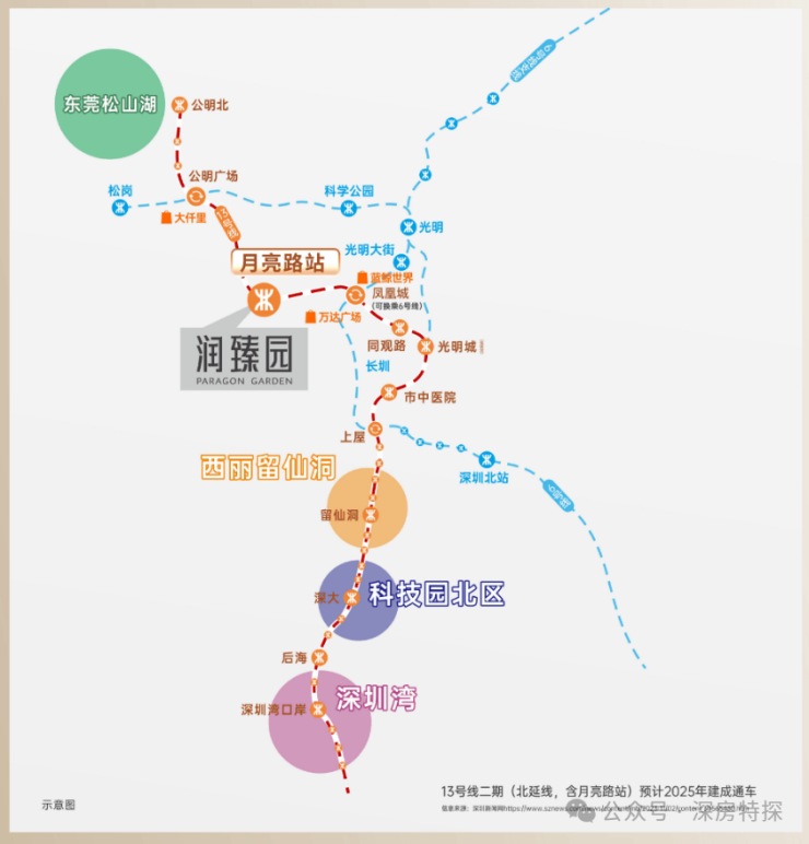 地铁13号线:纵贯光明、宝安、南山三区的深圳南北大动脉”。全期建成后,南接香港、北连东莞,串联光明科学城、南山、科技园、东莞松山湖、深圳湾总部基地等科创总部集群;(*规划中,该规划属于片区更新单元范围内。)