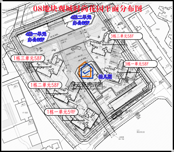 08地块共分3期建设,总占地面积约2.73万㎡,总建筑面积约37.41万㎡,计容建筑面积约27.51万㎡,容积率9.23,绿化率32.01%,共由5栋58-59层高住宅组成,其中1栋1单元住宅59F,1栋2/3单元住宅58F,3栋1单元/2单元住宅58F,4栋1/2单元写字楼35F,2栋是1所18班幼儿园,配建有公交首末站。