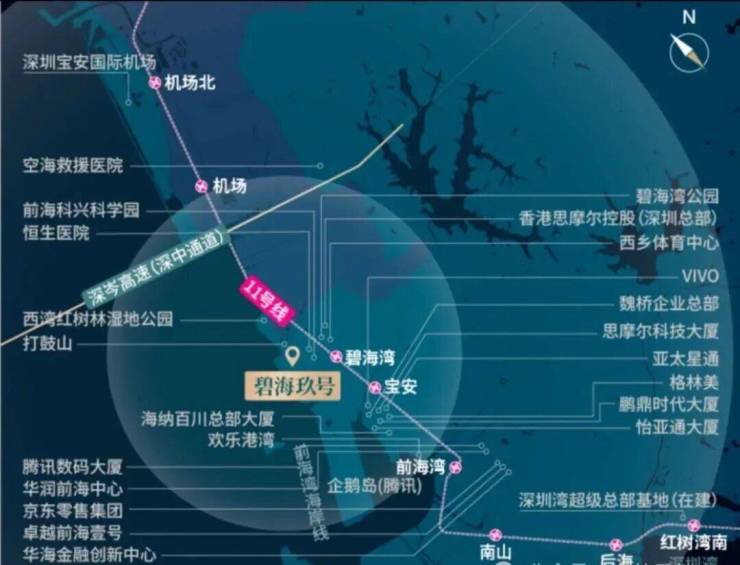 紧邻地铁11号线碧海湾站(约600m),1站机场、2站前海湾、4站后海、6站福田。