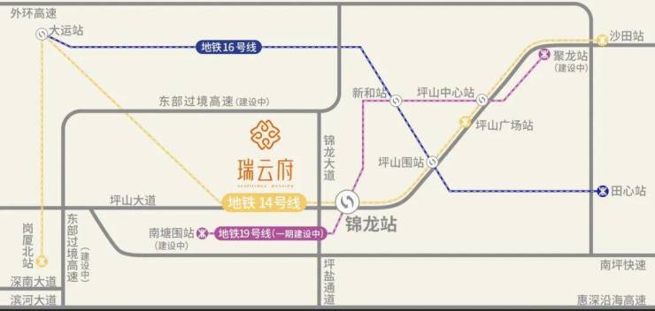 项目距离14号地铁线“锦龙站”约1.3公里,步行需要20分钟,该线路是从坪山沙田开往福田岗夏北的快速线,设计时速120公里,4站到大运,9站到布吉,10站到罗湖,12站到福田岗厦北,用时43分钟。