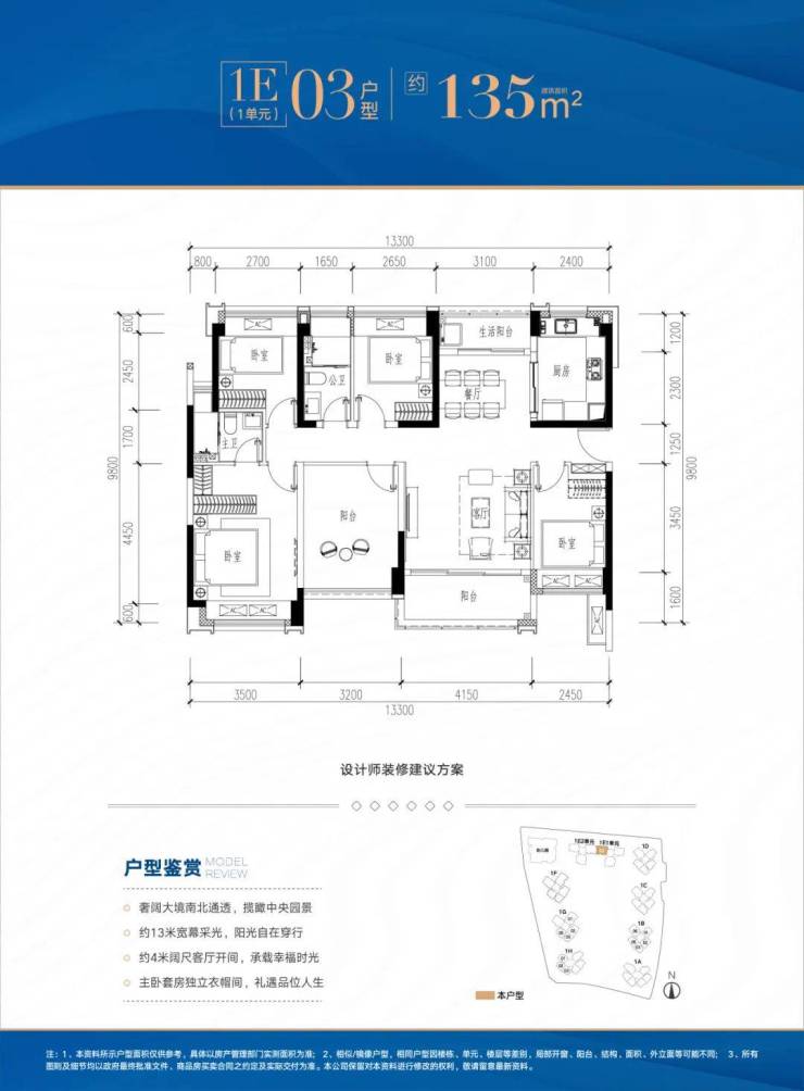 此外,约135㎡稀缺央景大五房,四开间朝南,将约2万㎡园林景观尽收眼底,双阳台与方正户型设计,让大宅生活的尊崇与舒适淋漓展现。