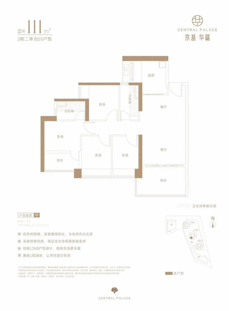 仅2栋2单元05户型才有,设计的是经典竖厅格局,LDKB一体化,动静分区,四开间朝南,U型厨房,卫生间干湿分离,得房率约73%(不含赠送),阳台西南朝向。