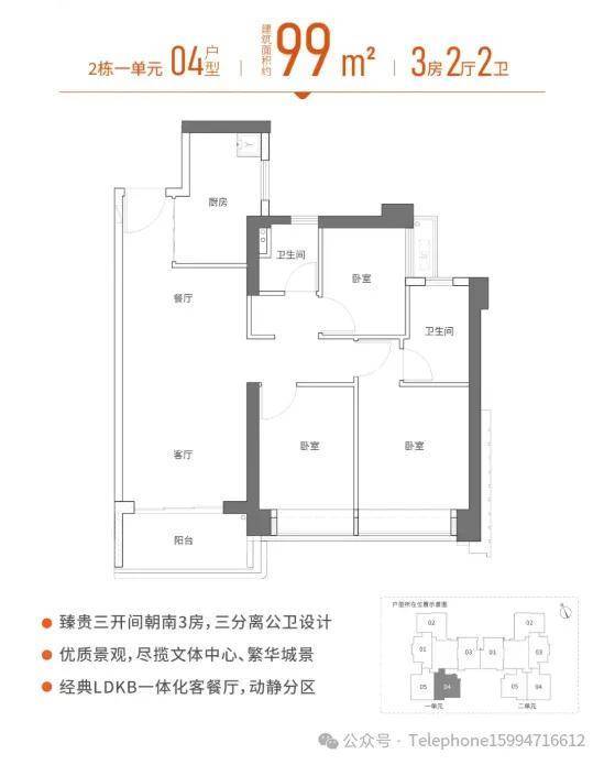 96/99㎡三房两卫:三开朝南-视野好景观佳