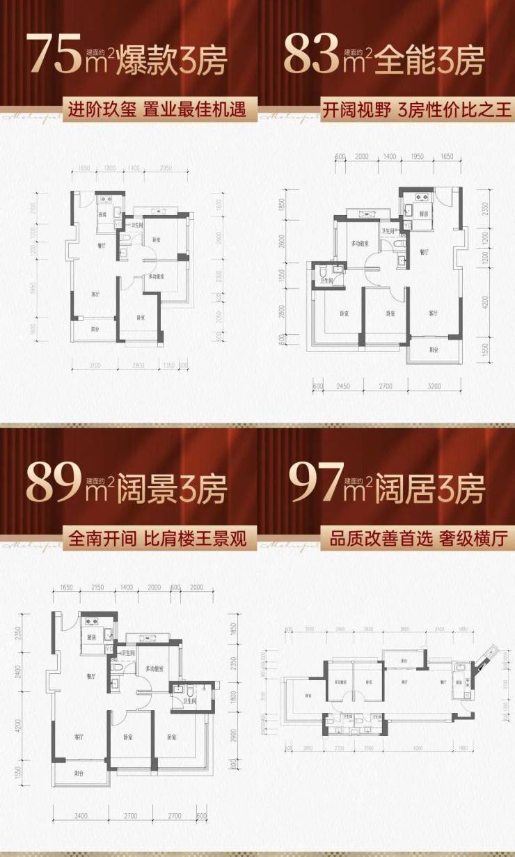 【户型产品】:约75-97㎡全能3房/约110-199㎡臻奢4房