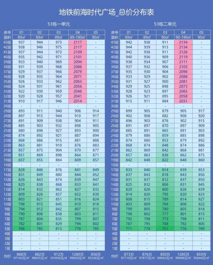 2024 年 5 月,前海时代三期推出 53 栋的 1 单元和 2 单元,共 344 套,面积在89-190㎡之间;单价区间在8.41-11.25万元/㎡,总价区间在751万-2134万元/套。开盘7 个小时去化约 82%。现只剩11套未备案。