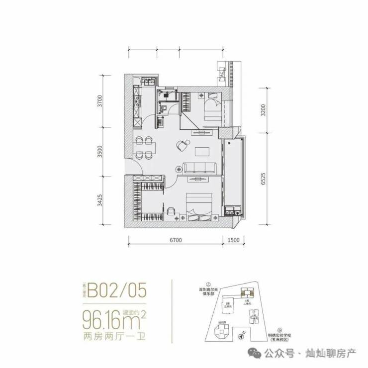 96㎡二房一厅,分布在02(东北向)和05(西南向)。作为「富通九曜公馆」入门级户型,细看主卧空间很大,硬隔个2+1房还凑合。但无论是二房还是2+1,一卫其实并不匹配福田这个位置的主流群体。