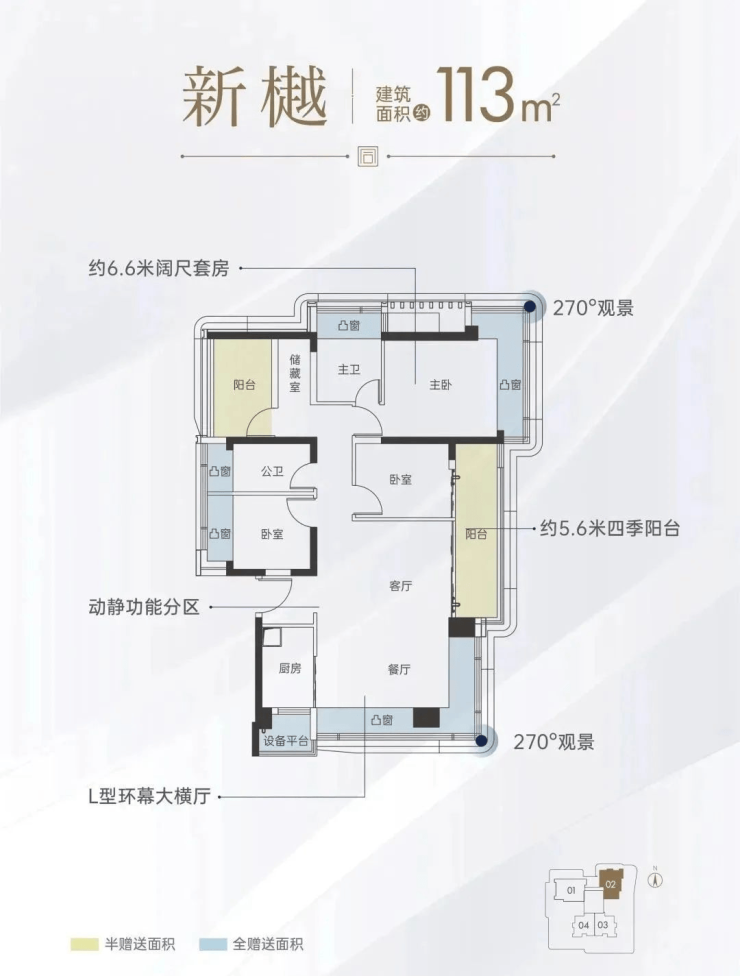 113㎡的4房2厅2卫,设计的是横厅南北通透格局,进门入户玄关,餐厅位双飘窗无敌视野,全屋6个飘窗面,客厅连接次卧出5.6米长的巨幕大阳台,厨房带1个设备平台,卫生间也带1个设备平台,得房率约95%(包含赠送),正东朝向。