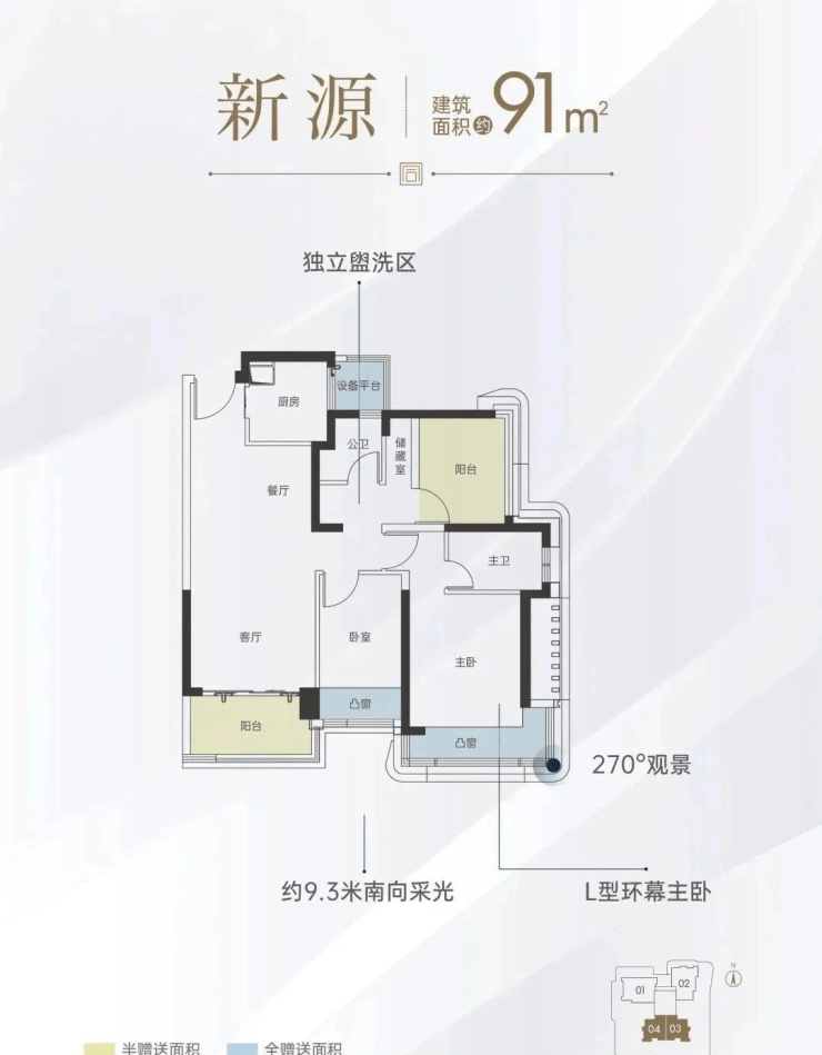 91㎡的3房2厅2卫,设计的是经典竖厅格局,进门入户玄关,客厅3.3米开间,三开间朝南,主卧转角飘窗带1个设备平台,厨房还带1个设备平台,得房率约90%(包含赠送),正南朝向。