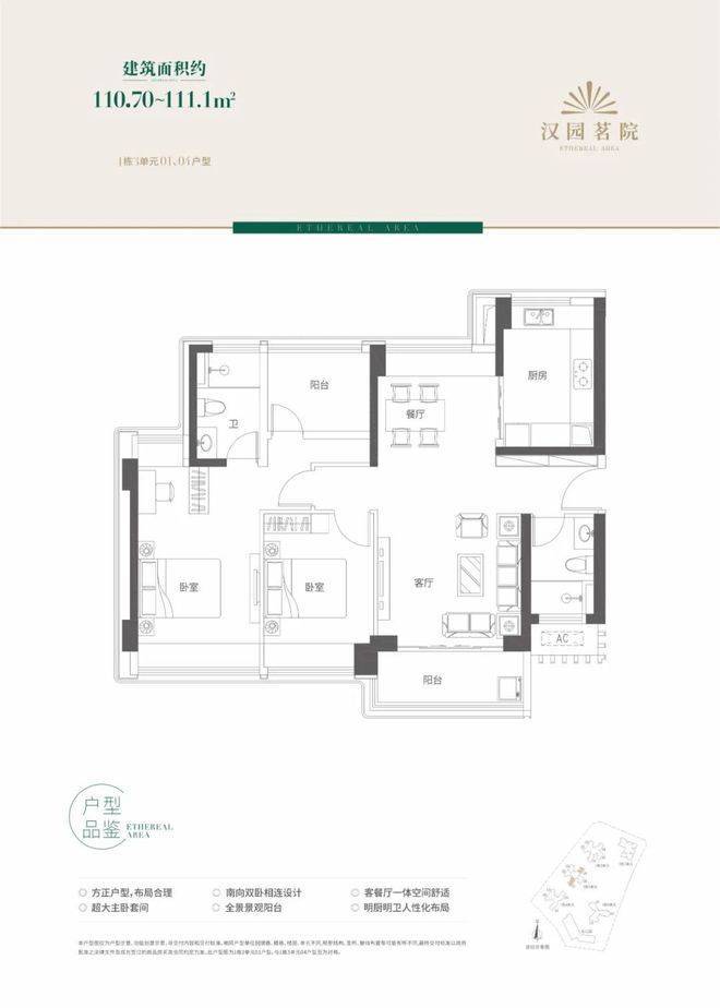 该户型南向双卧相连设计,客餐厅一体十分简洁。值得一提的是该户型厨房十分宽阔,对于乐于厨艺的购房者有更大的发挥空间。该户型面积段在110-111平米左右2房2厅2卫,但有一个阳台面积可以做一部分扩充和利用。